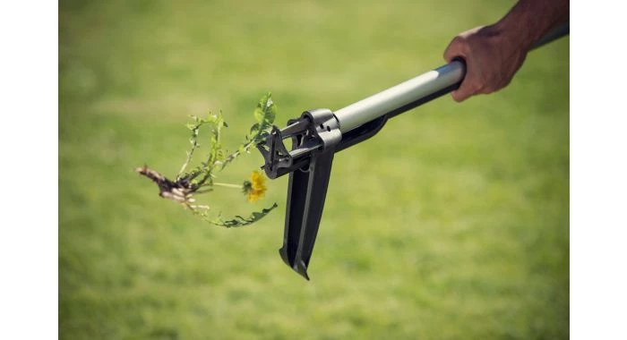 Emprisonnement de la mauvaise herbe entre les griffes du désherbeur au niveau des racines (jusqu’à 10 cm sous terre), Extraction de la plante avec ses racines grâce à un mécanisme de griffes breveté, Ouverture des griffes d’une simple pression sur le manche pour relâcher la mauvaise herbe