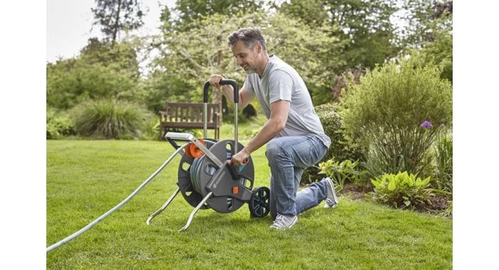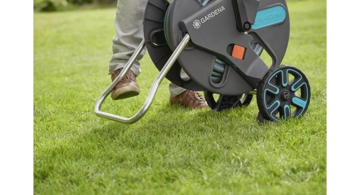 Le dévidoir métal sur roues Aquaroll L Easy GARDENA est idéal pour un arrosage pratique des grands jardins. Grâce à sa fonction “Kick & Stand” et aux roues surélevées, le dévidoir est particulièrement stable et ne tombe pas dès que l’on tire sur le tuyau d’arrosage.